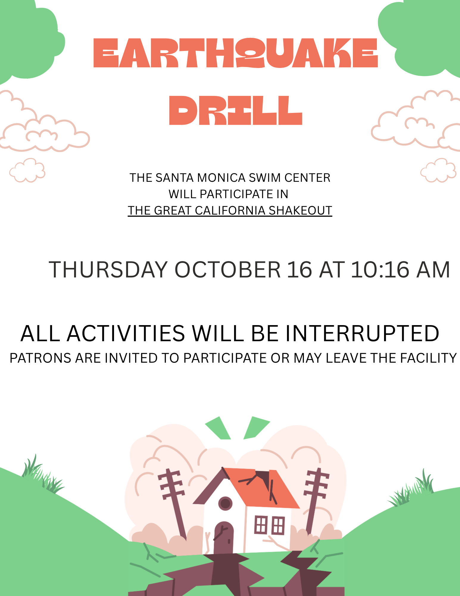 The Santa Monica Swim Center will participate in the Great California Shakeout on Thursday October 16th at 10:16am. All activities will be interrupted. Patrons are invited to participate or leave the facility.