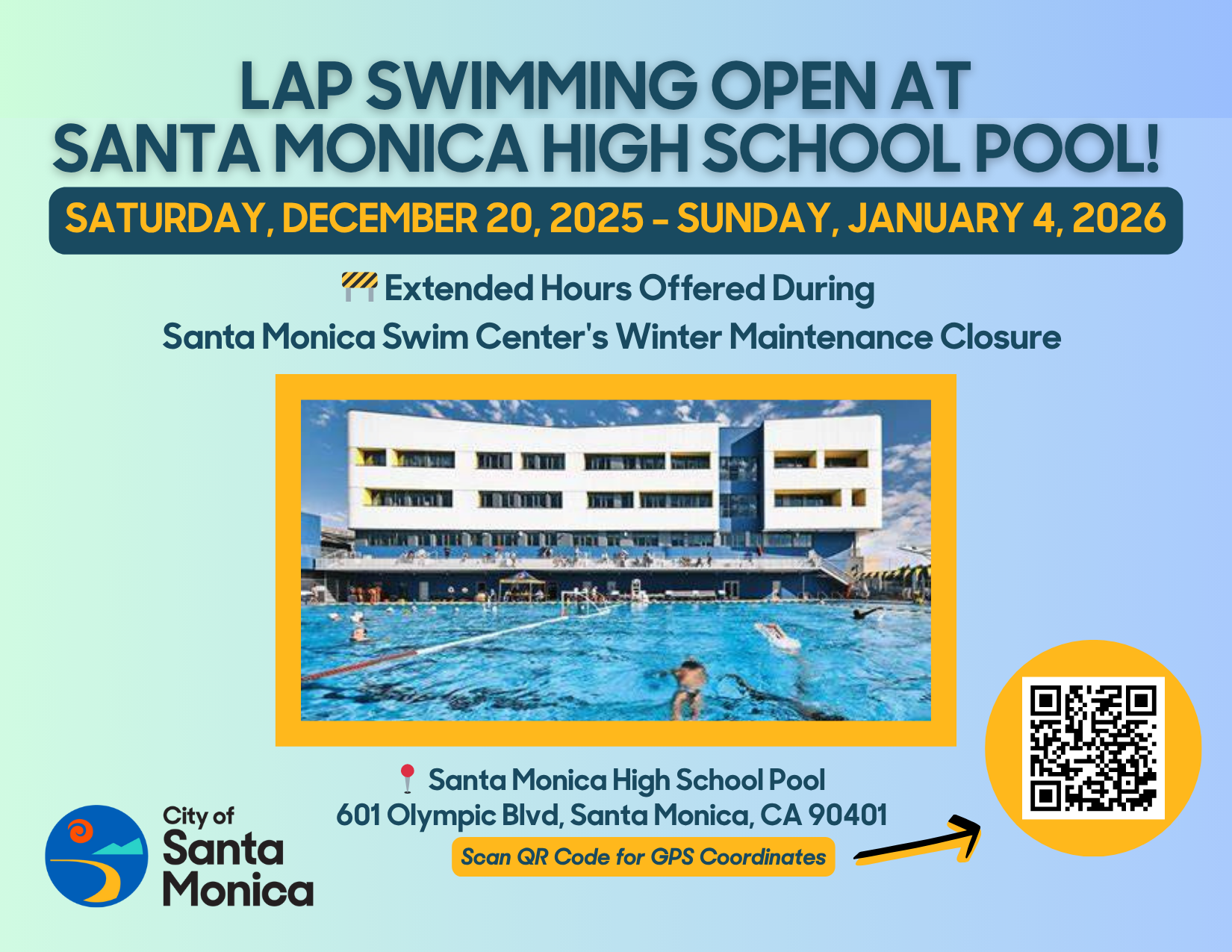 During the closure, lap swimming will be available at the Santa Monica High School Pool from Saturday, December 20, 2025, through Sunday, January 4, 2026.