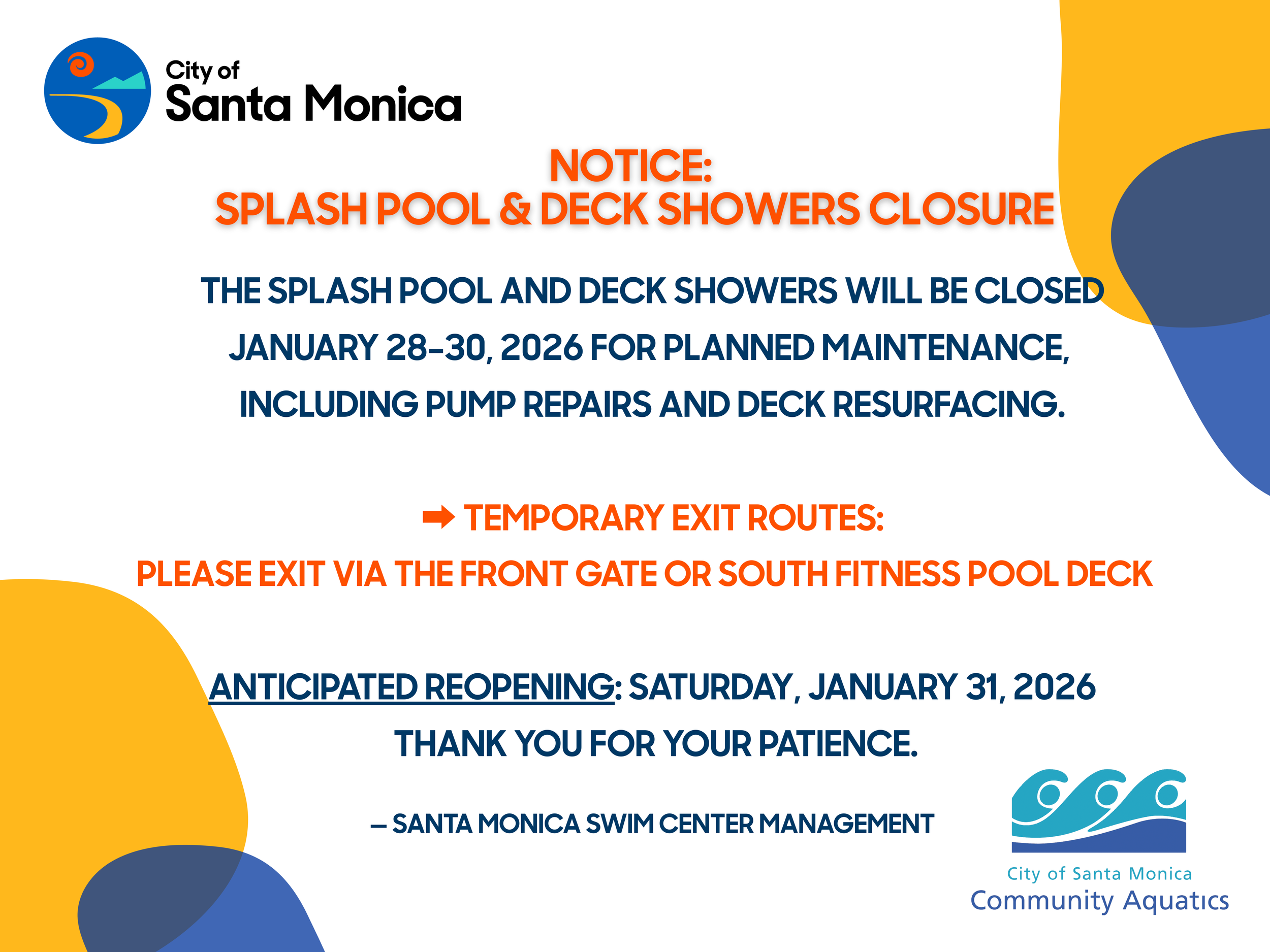 The Splash Pool and deck showers will be closed for planned maintenance January 28–30 due to circulation pump repairs and deck resurfacing work. The Splash Pool is expected to reopen on Saturday, January 31, 2026. All other Swim Center amenities remain open.
