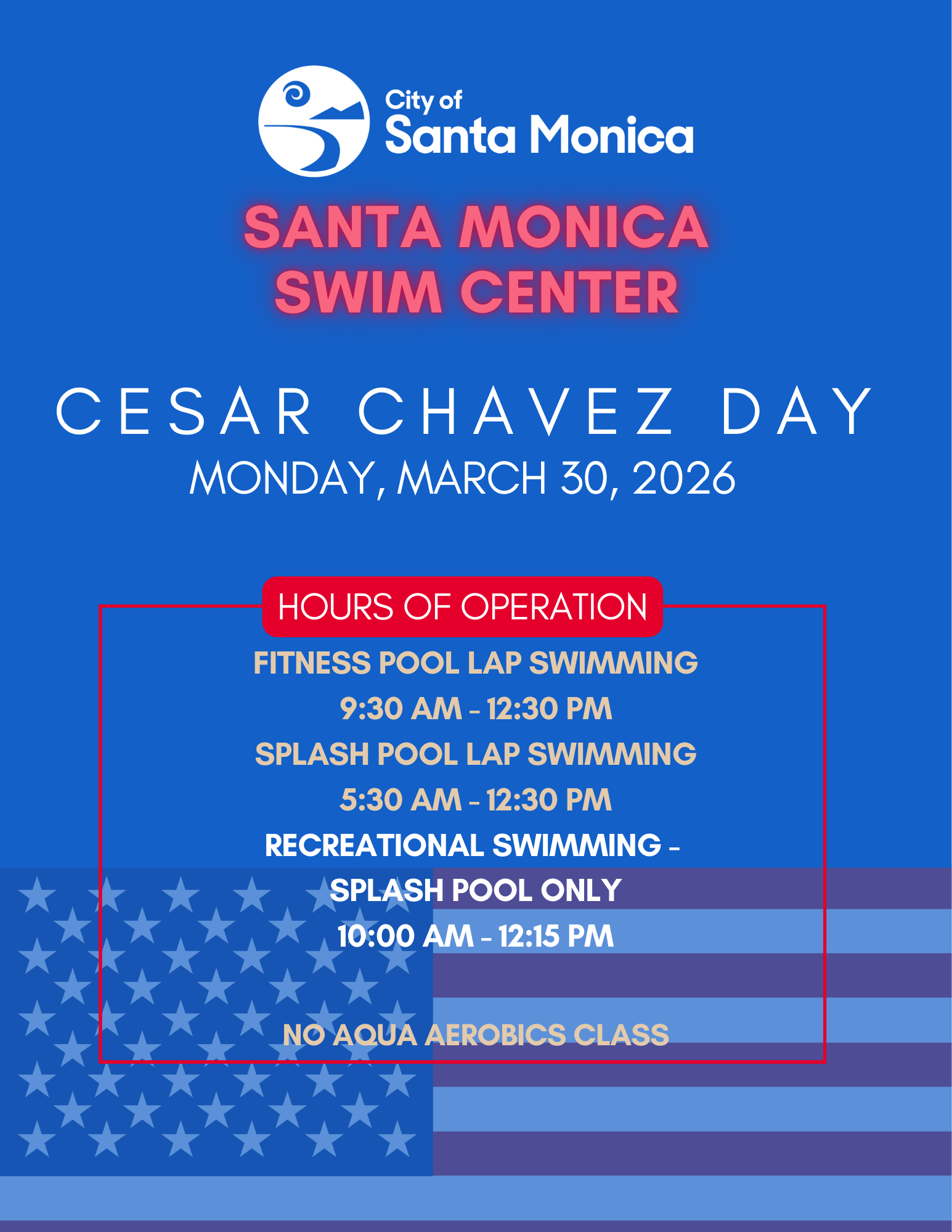 The Santa Monica Swim Center will be open Cesar Chavez Day Monday March 30th from 5:30am-12:30pm for lap swim and recreational swimming from 10:00am - 12:15pm. No same day call in reservations for lap swim that day.